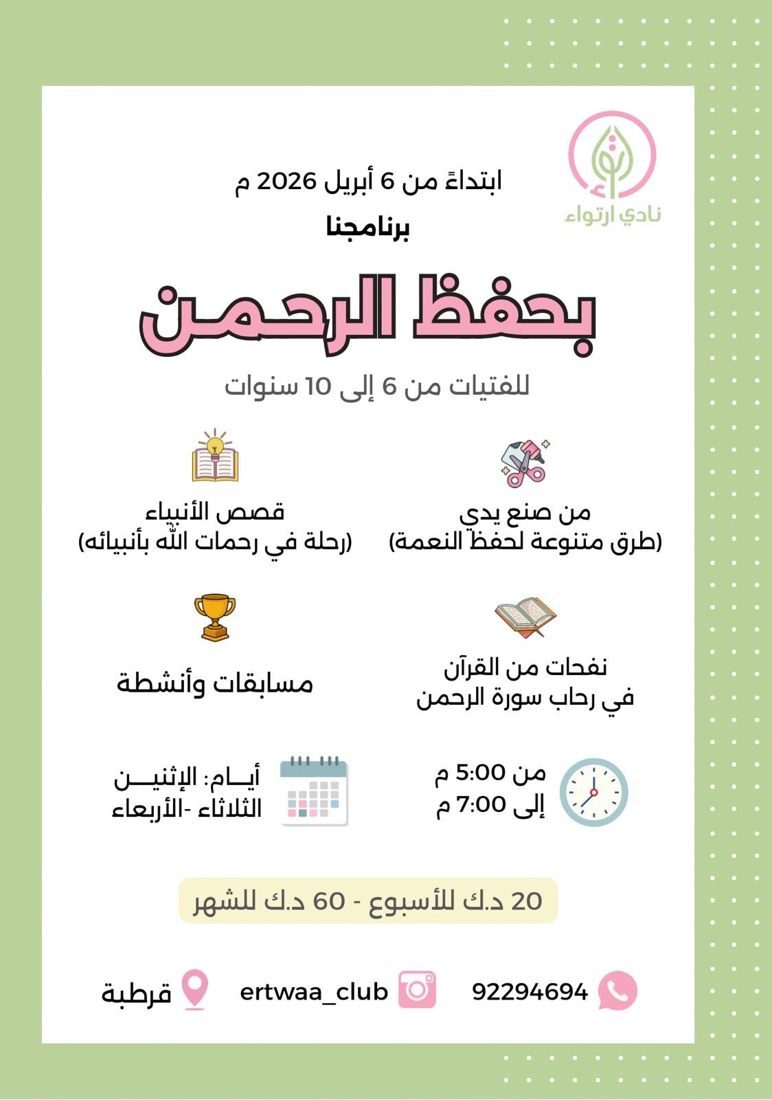 يعلن نادي *ارتــواء* عن برنامج ✨ *بحفظ الرحمن* ✨ ابتداءً من يوم الإثنين 6-4-2026م 💗 للفتيات من عمر 6 إلى 10 سنوات 💗 🗓️ *الأيام:* الإثنين - الثلاثاء - الأربعاء ⏳*الوقت:* من الساعة 5 إلى 7 م 📍*المكان:* قرطبة 🌟 *البرنامج:* - نفحات من القرآن في رحاب سورة الرحمن - قصص الأنبياء (رحلة في رحمات الله بأنبيائه) - من صنع يدي (طرق متنوعة لحفظ النعمة) - أنشطة ومسابقات *الرسوم:* 20 دك للأسبوع 60 دك لل 4 أسابيع للتسجيل والاستفسار: 92294694 🌟 *المقاعد محدودة* 🌟